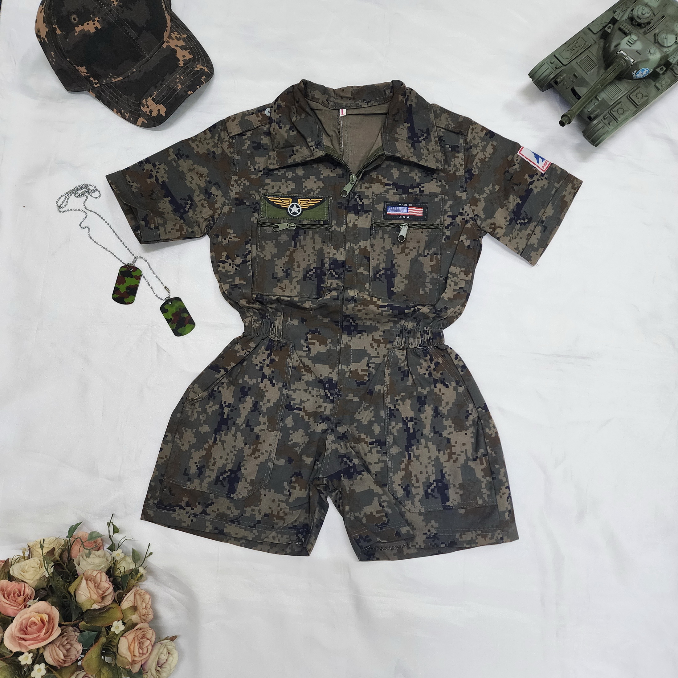 ชุดจัมพ์สูทลายพราง ติดอาร์มนักบิน ผ้าเนื้อไม่ยืด บาง เอวมียางยืดจัมพ์เอว ทรงเสื้อเป็นแขนสั้น มีกระเป๋าซิปด้านหน้า กางเกงขาสั้น มีกระเป๋าข้าง ไซร์ S-XL ใส่ได้ทั้งเด็กชาย เด็กหญิง อายุ 1-6ปี หมวกเป็นฟรีไซร์นะคะ รอบหัว 45-55 cm.ใส่ได้ค่ะ มีสายปรับด้านหลัง